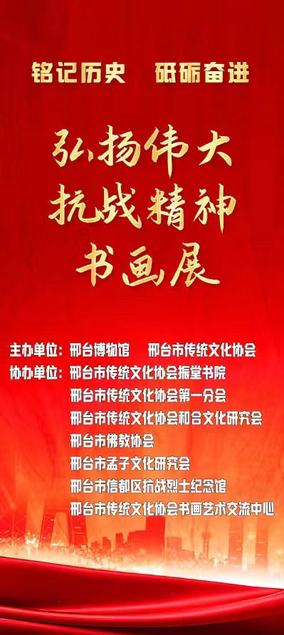 本次展览不仅是一场书画艺术呈现,更是一堂生动的爱国主义教育课。我们将以此次书画展为契机,大力弘扬伟大抗战精神,共同营造崇尚英雄、珍爱和平的浓厚氛围。进一步铭记历史、缅怀先烈、珍爱和平、开创未来,将伟大的抗战精神转化为我们前进的动力,为建设“太行泉城 美丽邢台”,为实现中华民族伟大复兴而不懈奋斗!