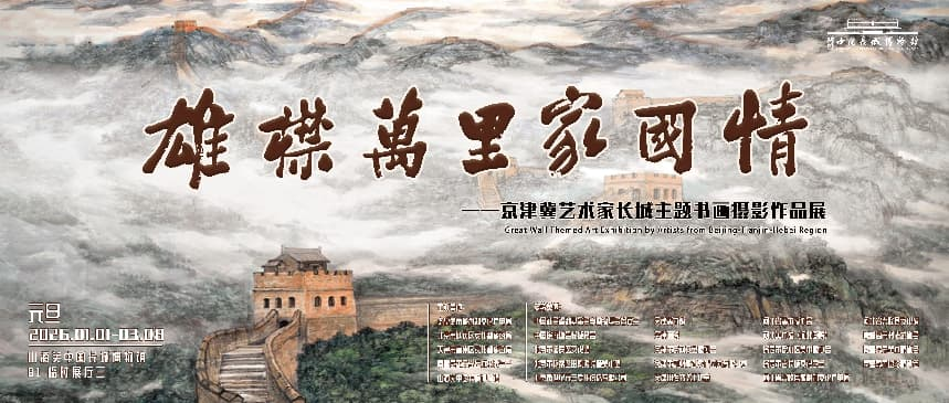 展览简介:雄襟万里家国情——京津冀艺术家长城主题书画摄影作品展,由秦皇岛市旅游和文化广电局、北京市延庆区文化和旅游局、天津市蓟州区文化和旅游局、秦皇岛市文学艺术界联合会、山海关中国长城博物馆联合主办,京津冀三地19家单位提供支持,将于2026年1月1日在山海关中国长城博物馆开幕。本次展览,计划展陈书法作品42幅,绘画作品46幅,摄影作品40幅,从不同维度展现中国长城的雄姿,寄托艺术家对祖国、民族的深厚感情,体现环渤海、京津冀地区协同发展在文化领域的成果。